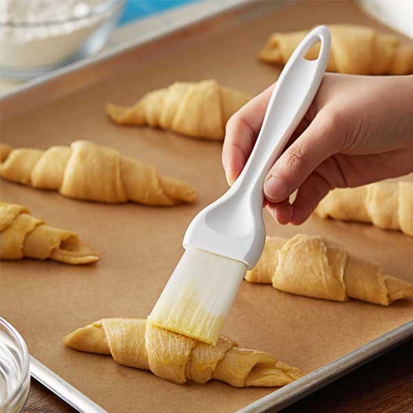This 1 1/2″ brush highlights long-lasting nylon bristles that are the perfect softness for all your basting needs. These bristles have a high fluid retaining capacity, so whether you dip this brush in water, egg, or butter, it works to dispense this evenly over your pastries as opposed to absorbing it into the bristles. Also, the white bristles on this brush can be used as part of a color-coded system that improves food safety and prevents cross-contamination in your kitchen. With its elegant design, this brush is perfect for jobs like basting a roast, buttering phyllo dough sheets, or applying an egg wash on large loaves and pastries.