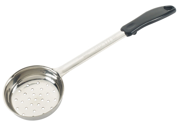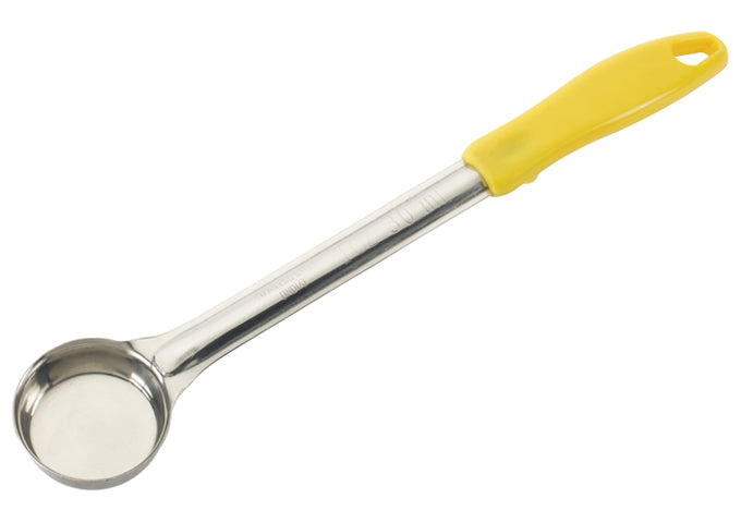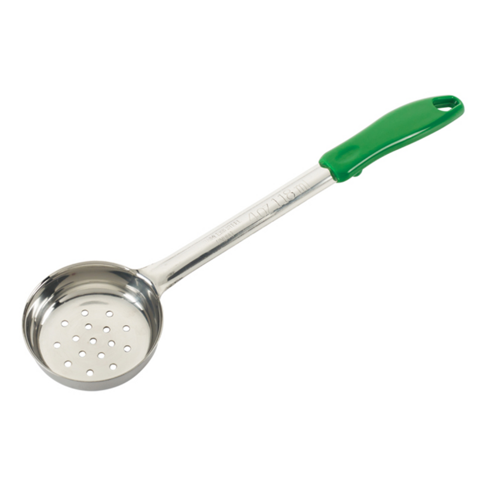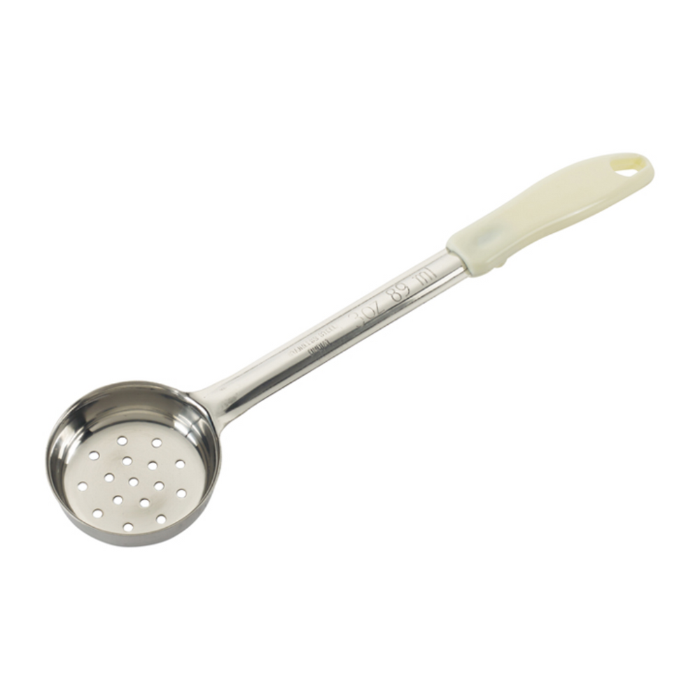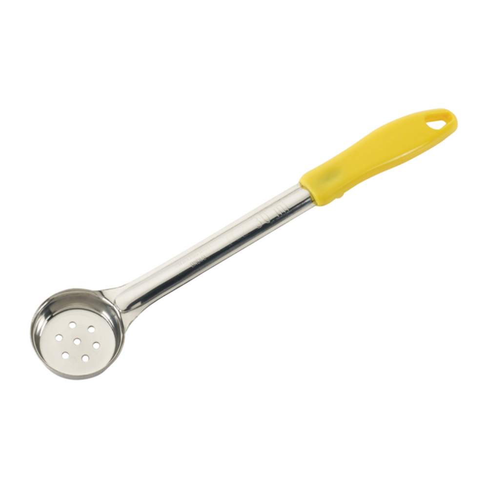 The Winco stainless steel food portioner, designed for scooping and serving consistent portions of food such as mashed potatoes, vegetables, or ice cream. It has a yellow plastic handle for comfortable and non-slip grip, and The perforated design allows for efficient draining of liquids and ensures consistent portioning. Ideal for use in commercial kitchens, buffets, or catering events, the Winco Stainless Steel Portioners is a reliable and durable tool that can make food service easier and more efficient.