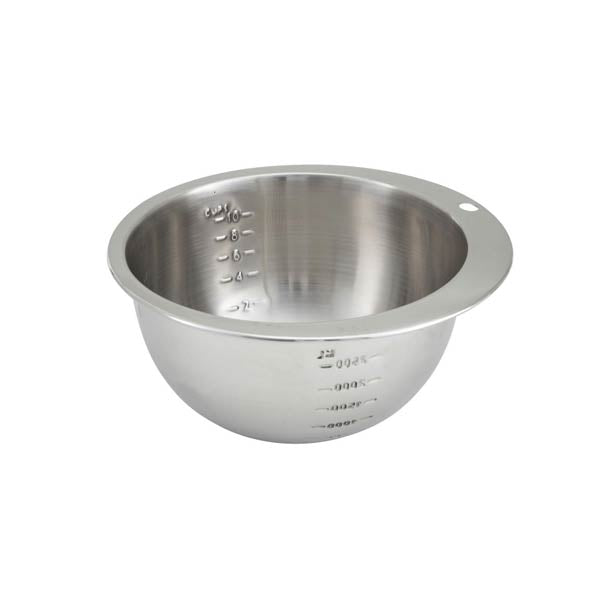 An attractive addition to both home and commercial kitchens, the 10 Cup Measuring Bowl from Winco simplifies food preparation time. Highlighting interior graduations, this measuring bowl guarantees accurate measurements and is big enough for mixing wet and dry ingredients. Crafted from exceptionally durable stainless steel, this measuring bowl is easy to clean and tarnish-proof. For added convenience, this measuring bowl has a wide lip for an easy grip.