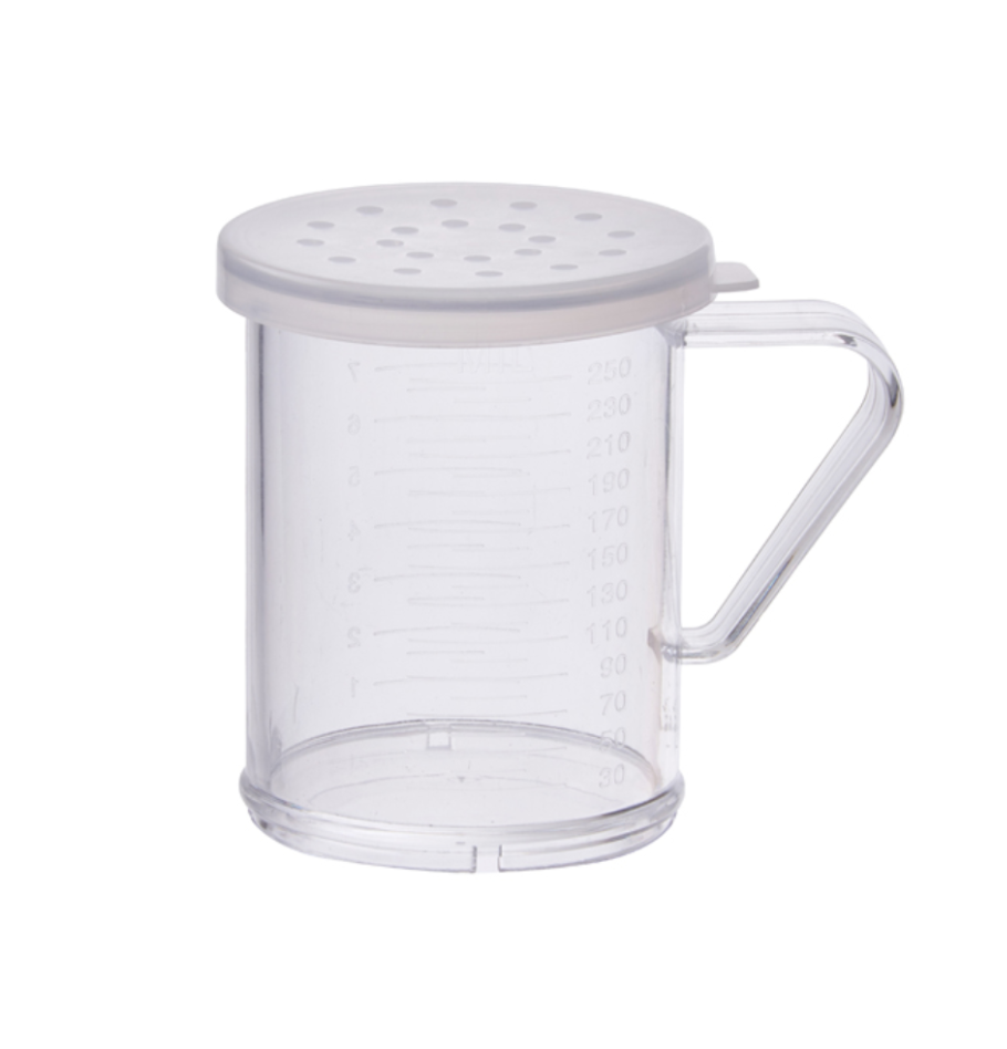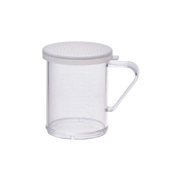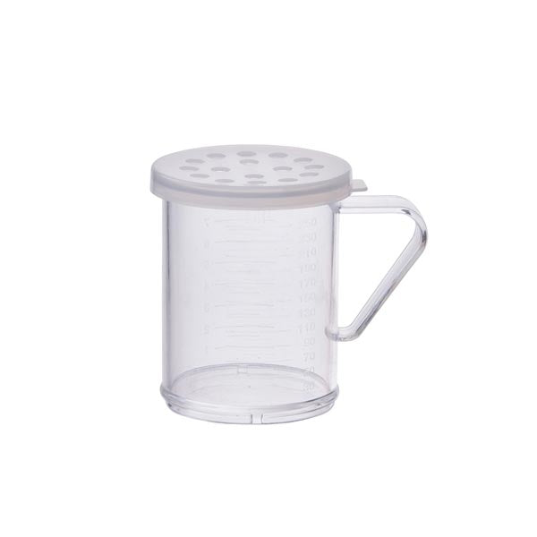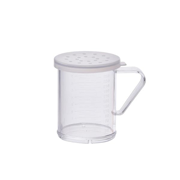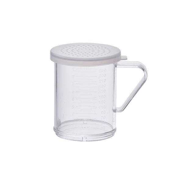 Get the 10 Oz. Clear Polycarbonate Dredge with Small,Medium,Large,Extra Large Hole Snap-On Lid from Winco for commercial kitchen use. This clear dredge, made of durable plastic, has measurement marks in ounces and milliliters and includes snap-on lids for coarse, medium, and fine distributing of dredge materials. Handy and easy to clean, the interchangeable lids snap-on and off easily making it the ideal kitchen tool for shaking salt, pepper, chili powder, powdered sugar, and other spices in pizza shops, restaurants, and bakeries.