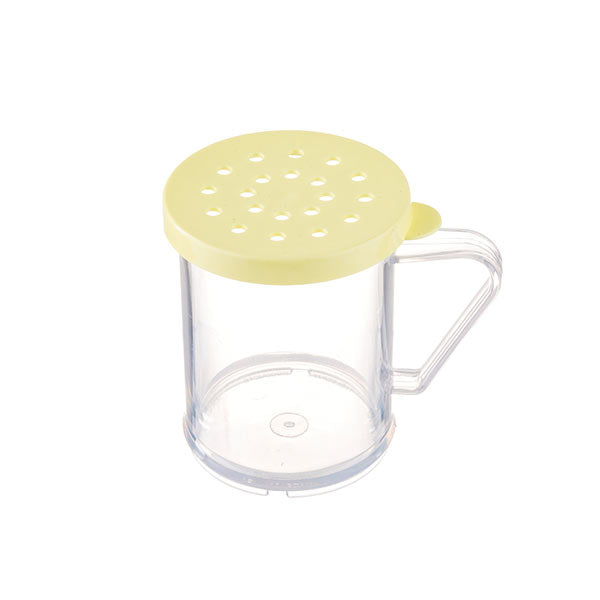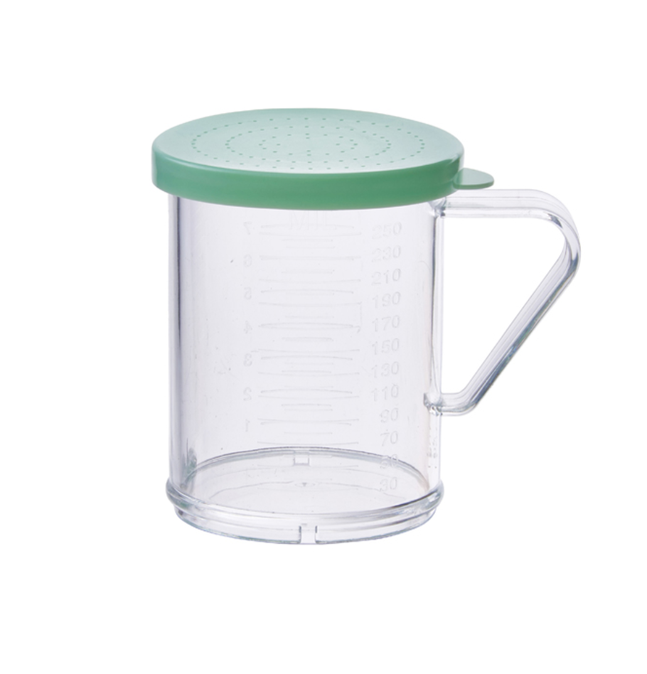 Make it easy to dispense just the right amount of medium ground product onto your pizzas with this 10 Oz. Clear Polycarbonate Dredge with Snap-On Green,Beige,Red Lid. This shaker features an ultra-durable polycarbonate body to meet the demands of today’s busy kitchen. It’s both crack and chip-resistant and is dishwasher safe for quick and easy cleaning. Ideal kitchen tool for shaking salt, pepper, chili powder, powdered sugar, and other spices in pizza shops, restaurants, and bakeries.