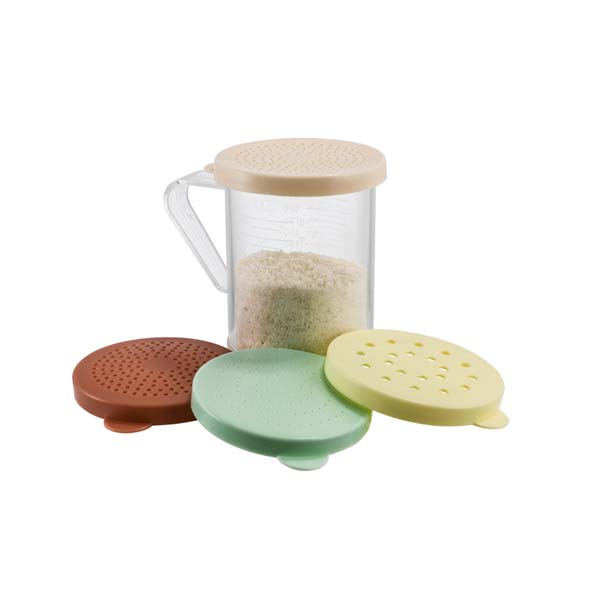 Get the 10 oz. Plastic Dredge with 4 Snap-on Lids from Winco for commercial kitchen use. This clear dredge, made of durable plastic, has measurement marks in ounces and milliliters and includes three (4) snap-on lids for coarse, medium, and fine distributing of dredge materials. Handy and easy to clean, the interchangeable lids snap-on and off easily making it the ideal kitchen tool for shaking salt, pepper, chili powder, powdered sugar, and other spices in pizza shops, restaurants, and bakeries.