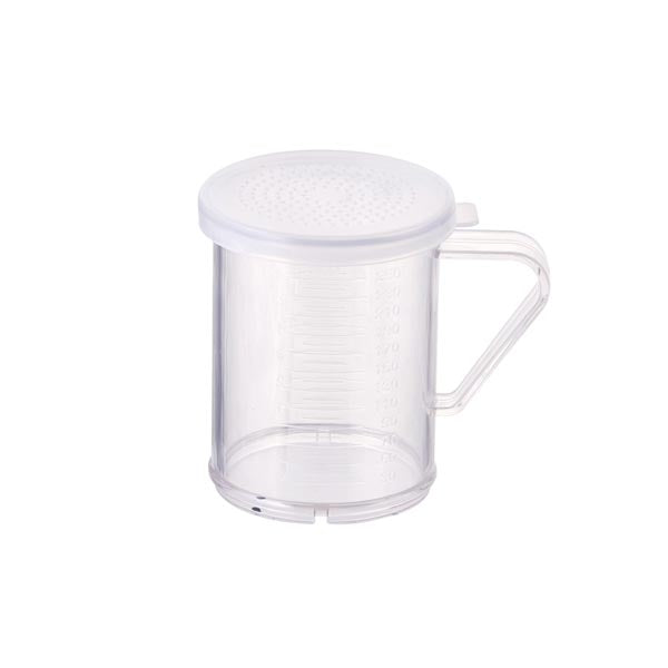 Get the 10 oz. Polycarbonate Dredge with 3 Snap-On Lids from Winco for commercial kitchen use. This clear dredge, made of durable plastic, has measurement marks in ounces and milliliters and includes three (3) snap-on lids for coarse, medium, and fine distributing of dredge materials.