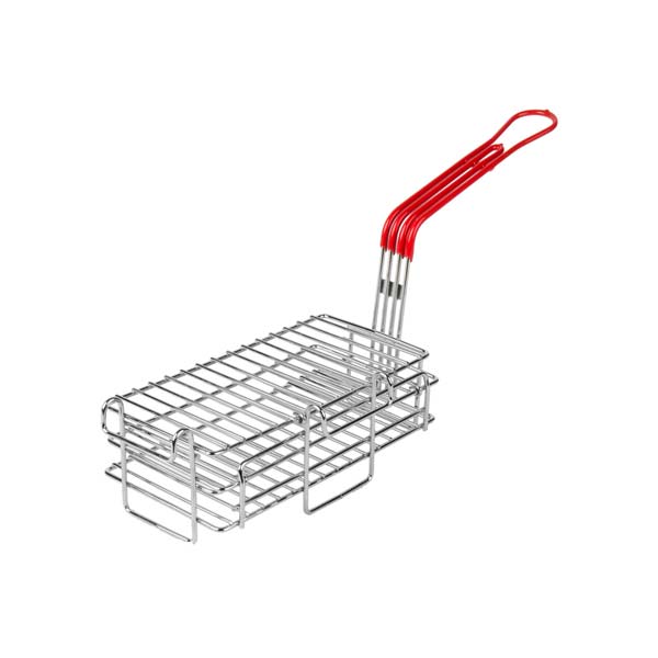Use this 11-1/2″ x 6″ Rectangular Chimichanga / Burrito Fry Basket with Red Handle from Winco to quickly and easily serve fresh and mouthwatering burritos at your Spanish-inspired restaurant. With its front and side hooks, this premium quality fry basket can be placed on top of a container for fast and efficient draining of excess oil.