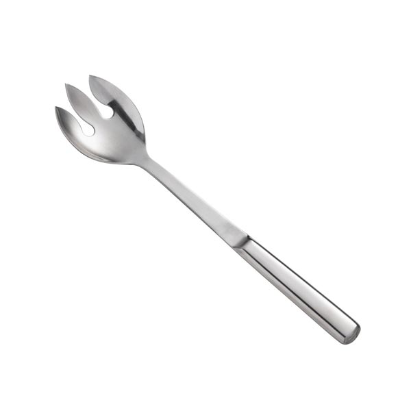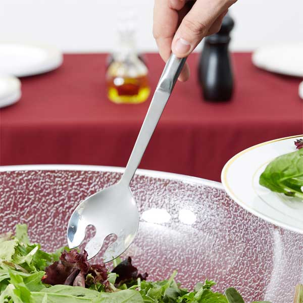 This 11 3/4″ hollow-handled, notched salad spoon is made of stainless steel with a mirror polish finish. This spoon’s notched design strongly collects lettuce to make serving a breeze. It can even be used to bicker difficult foods like spaghetti or linguine, making it an extremely versatile tool. Its classic, elegant design is perfect for upscale applications, but this is spoon is right at home for any number of events.