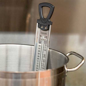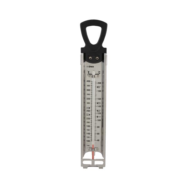 Featuring an easy-to-read, dual-range indicator, this paddle-type thermometer measures temperatures from 100° to 400° F. This thermometer quantifies the necessary temperature for caramelizing sugar and warming oil. To keep your hands free while you screen temperature, this candy/profound fry thermometer has a worked in the cut that effectively appends to the side of a pot. A staple for proficient sweets producers.