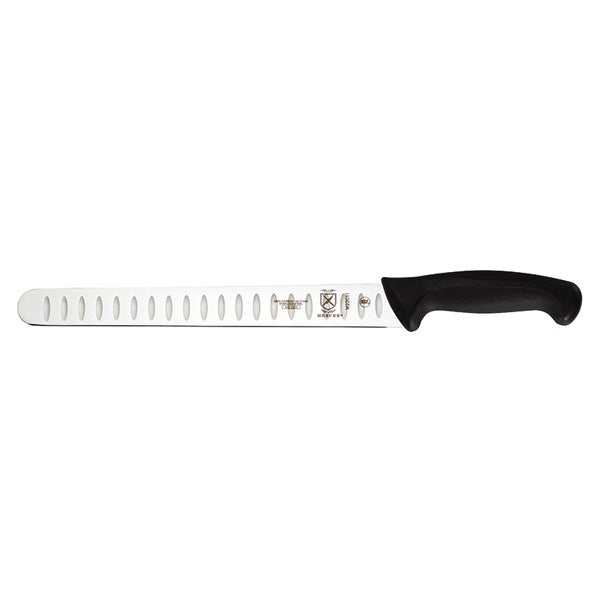 Assured to slide into the tough outer skin of any fruit, vegetable, or meat, the 11″ Granton edge slicer knife is a sturdy tool for any commercial task. This knife’s