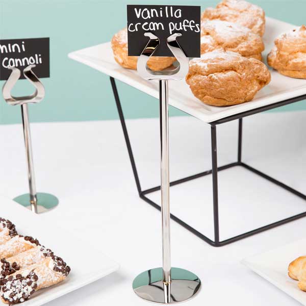 Excellent for catering events, weddings, or cafeterias, this 12″ Harp Clip keeps buffet lines moving fast and efficiently. You can be sure this cardholder will stay upright and strong whether it is on a stationary buffet table or mobile serving cart. With a unique harp design and stainless steel construction, this cardholder works as a conversation piece while still combining seamlessly with most decor. Its smooth design won’t clutter valuable tabletop serving space so you can use it for plates, utensils, or napkins instead.
