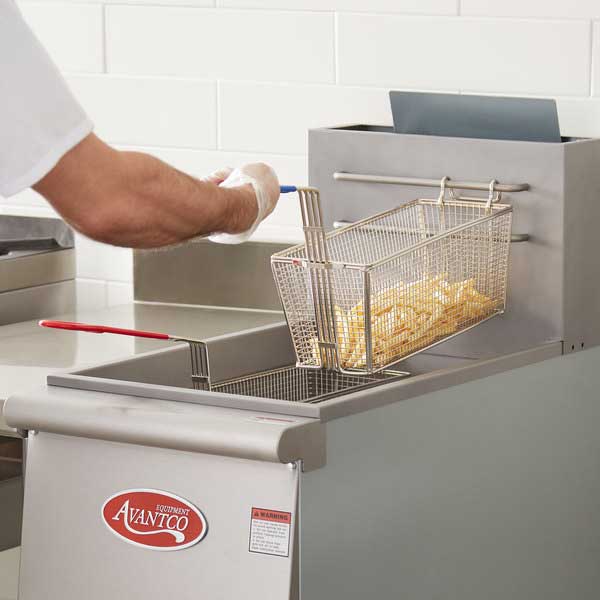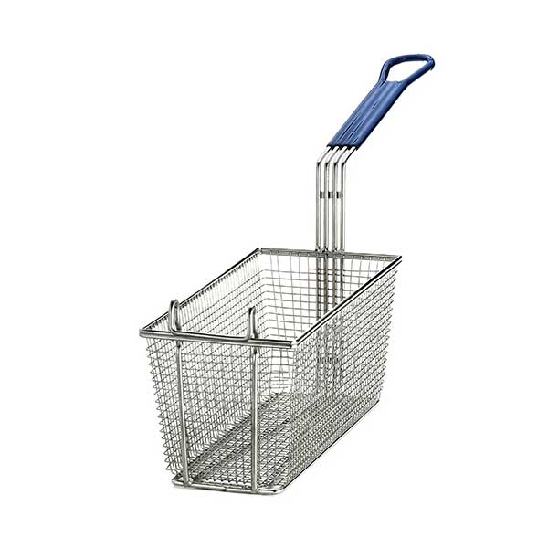 This long-lasting 13.25″ x 5.75″ Rectangular Nickel Plated Fry Basket / Tablecraft from TableCraft features nickel-plated material and has a blue, cool-to-touch vinyl-coated handle. It is used for frying up chicken nuggets, french fries, hush puppies and so much more.