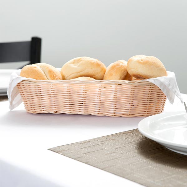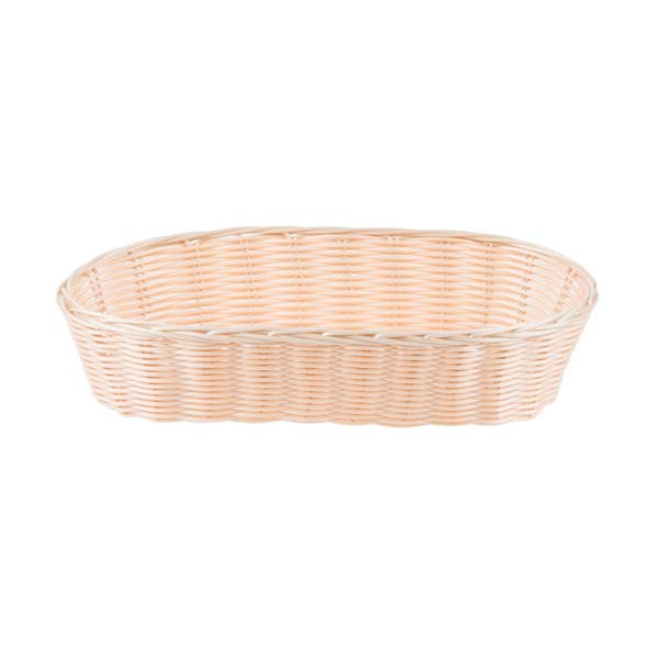 This 13 ” x 5″ Oblong Rattan-Like Basket is made from smooth poly cord, giving a sleek, glossy exterior with an elegantly braided rim and no jagged edges. Its woven, ribbed design strengthens the bottom and sides, providing a durable construction ideal for serving candy, chips, and crackers, as well as small rolls and bread slices. Cleaning this basket is as simple as wiping it down with a damp cloth to guarantee each customer gets the best presentation.