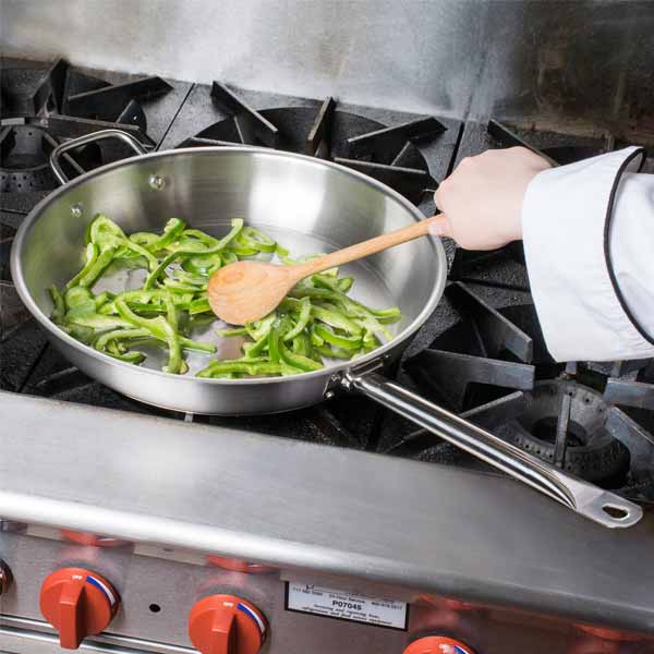 Whether you’re frying, sauteing, or steaming, this 14″ fry pan will support you get the job done. Created with shallow, curved sides, this pan helps easy stirring while its 18/8 stainless steel construction distributes heat evenly across the surface. With its 6-point welded handle, this NSF approved fry pan provides a comfortable grip for excellent balance and control.