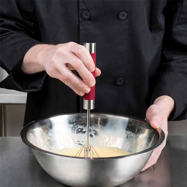 This 14″ stainless steel rotary whisk/whip makes foaming milk, beating eggs, and whipping batter a bit of cake. In contrast to standard structures, this whisk has a push-rotational element that permits you to whip fixings absent a lot of exertion. You should simply push on the handle and the whisk accomplishes the work for you. As you apply or withdraw pressure, the whisk turns quickly and blends your fixings rapidly and proficiently.