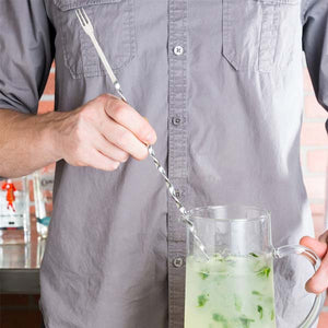 The unique design is perfect for making specialty cocktails such as martinis, mojitos, or strawberry daiquiris since you can mix drinks with the spoon and add fruits and other ingredients with the fork. With the 17 1/2″ length, this multi-use tool is also excellent for stirring up taller mixed drinks, drink pitchers, or retrieving drink garnishes from large containers in addition to keeping a safe and sanitary distance between the bartender’s hand and the glass. Constructed of durable and attractive stainless steel, this bar mixing spoon with fork enhances the look of your bar environment while enabling for quick and easy cleanup after every use.