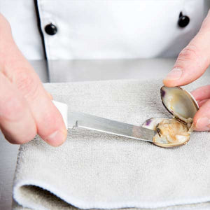 The narrow blade of this 3 1/4″ Stainless Steel Clam Knife with White Textured Poly Handle has a sharp edge that allows you to effortlessly insert and cut through the seal of a clam’s shell. The thin blade construction makes it easy to cut into small clams, and its rounded tip guarantees your safety while in use.