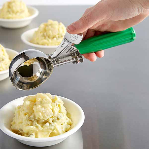 Best for use in a high volume environment, this 3.25 oz Stainless Steel Thumb Press Disher is constructed of stainless steel with all metal parts for added durability and cleanability. Its handle makes the capacity sizing and portion control a breeze when serving hot or cold foods in your restaurant, cafeteria, or bakery.