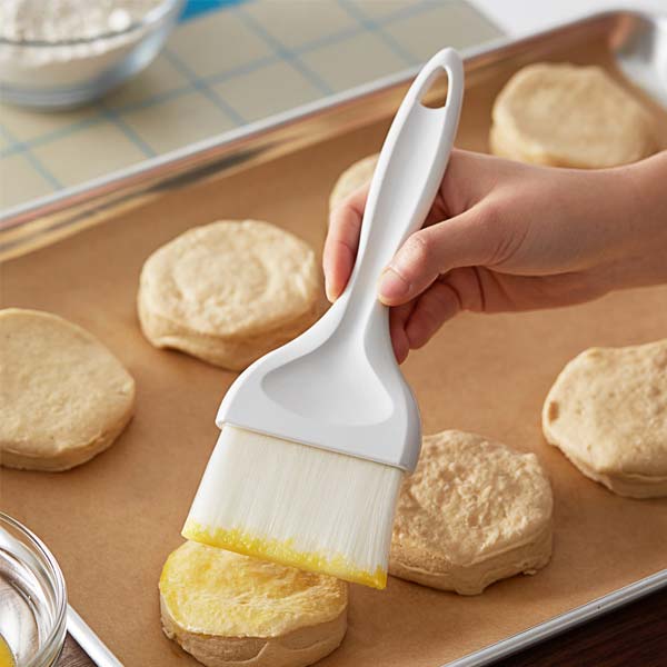 This 3″ brush highlights long-lasting nylon bristles that are the perfect softness for all your basting needs. These bristles have a high fluid retaining capacity, so whether you dip this brush in water, egg, or butter, it works to dispense this evenly over your pastries as opposed to absorbing it into the bristles. Also, the white bristles on this brush can be used as part of a color-coded system that improves food safety and prevents cross-contamination in your kitchen. With its wide design, this brush is perfect for jobs like basting a roast, buttering phyllo dough sheets, or applying an egg wash on large loaves and pastries.