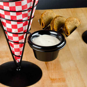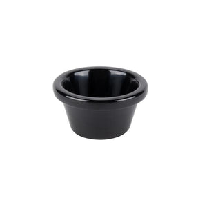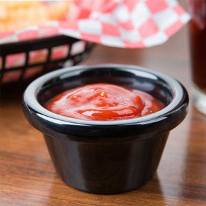 This 3 oz. Black Melamine Ramekin is ideal for individual portions of butter, salsa, condiments, and sauce. Each ramekin is constructed of thick-walled, heavyweight melamine for easy care. In addition to filling this ramekin with salsa or marinara sauce to serve with appetizers, you can serve honey or maple syrup at your breakfast buffet. Also, it’s excellent for portion control when you want to serve small amounts of condiments like sour cream, guacamole, and salad dressing.