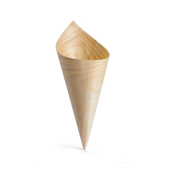 This cone is a rustic and charming alternative to conventional plates or bowls. Guests can experience your fine desserts or appetizers in style at your catered event, restaurant, or upscale cafe. Made of pinewood, this serving cone is an exceptional choice for environmentally-conscious businesses. The versatile cone shape can be easily held in guests’ hands as they mingle, or placed flat on a serving tray during dinner service.