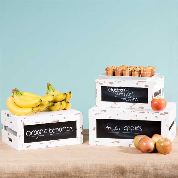 Add an eye-catching, rustic charm to your buffet or display setting with this 3-Piece Distressed Wood Chalkboard Crate Riser Set. A small, medium, and large riser are included, providing users to create an attractive, layered food display. Give a variety of appetizers, hors d’oeuvres, and desserts on each tier for your guests to choose from. When not in use, this set even nests together for efficient, space-saving storage.