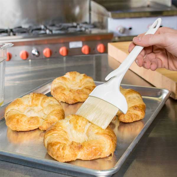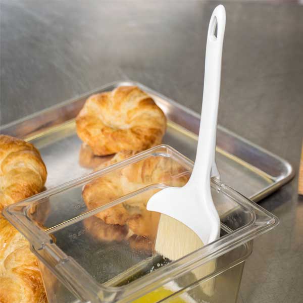 A great addition to your home, bakeshop, or other foodservice facilities, the 3″ Wide Boar Bristle Pastry Brush with Concave Head and Hook from Winco is excellent for coating pies and pastries with egg wash or for basting barbecue ribs. This brush has durable nylon bristles that are heat resistant and epoxy-set to ferrules to prevent bacteria from collecting. This brush can be hung on the lip of crocks or containers while its one-piece plastic handle provides a comfortable grip.