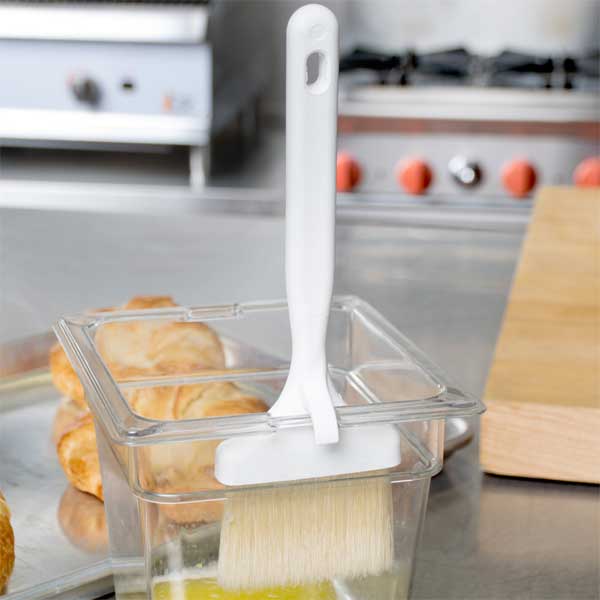 A great addition to your home, bakeshop, or other foodservice facilities, the 3″ Wide Concave Pastry Brush with Hook from Winco is excellent for coating pies and pastries with egg wash or for basting barbecue ribs. This brush has durable nylon bristles that are heat resistant and epoxy-set to ferrules to prevent bacteria from collecting. This brush can be hung on the lip of crocks or containers while its one-piece plastic handle provides a comfortable grip.