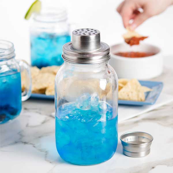Put a brand-new, new bend on the great mixed drink shaker with this 30 oz. Glass 3-Piece Mason Jar Cocktail Shaker / Tablecraft! This 3-piece shaker includes a thick glass