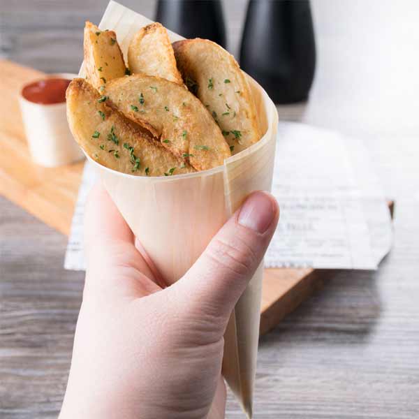 This 4.75 oz. Large Wooden Disposable Serving Cone is a rustic and charming alternative to conventional plates or bowls. Guests can experience your fine desserts or appetizers in style at your catered event, restaurant, or upscale cafe. Made of pinewood, this serving cone is an exceptional choice for environmentally-conscious businesses. The versatile cone shape can be easily held in guests’ hands as they mingle, or placed flat on a serving tray during dinner service.