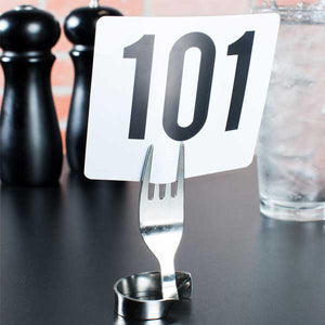 Built of polished stainless steel, this unique cardholder resembles a dinner fork and is certain to suit the feel of your trendy restaurant or catered event. The compact style of this cardholder is simple and sleek without overpowering your food display. Best of all, it saves you precious tabletop space. Presenting style and function, this versatile cardholder is perfect for a variety of applications. Not only can you use it to display recipe names or label deli bowls for easy identification in buffet lines, but you can also set it in front of food baskets to attractively present your baked goods.