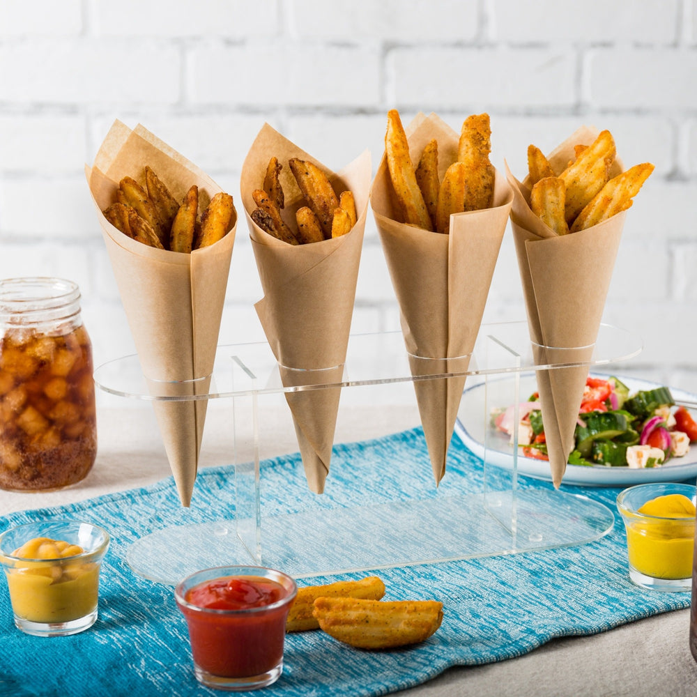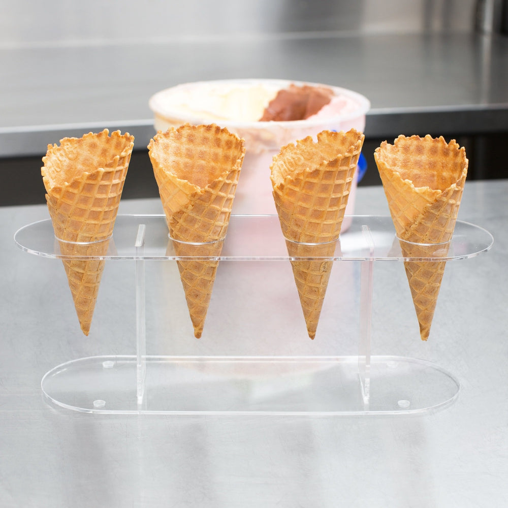 The 4 Hole Acrylic Cone Holder Stand by Winco is a practical and stylish way to serve ice cream cones. The holder features four evenly spaced holes, each designed to securely hold a single cone.