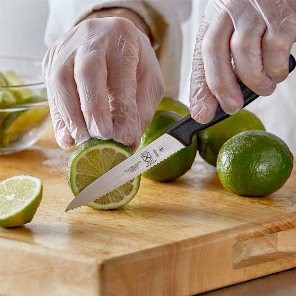This 4″ Serrated Pointed Tip Paring / Bar Knife with Guard is designed to effortlessly cut fruits, herbs, and vegetables for garnishing a Bloody Mary, Moscow mule, daiquiri, or your