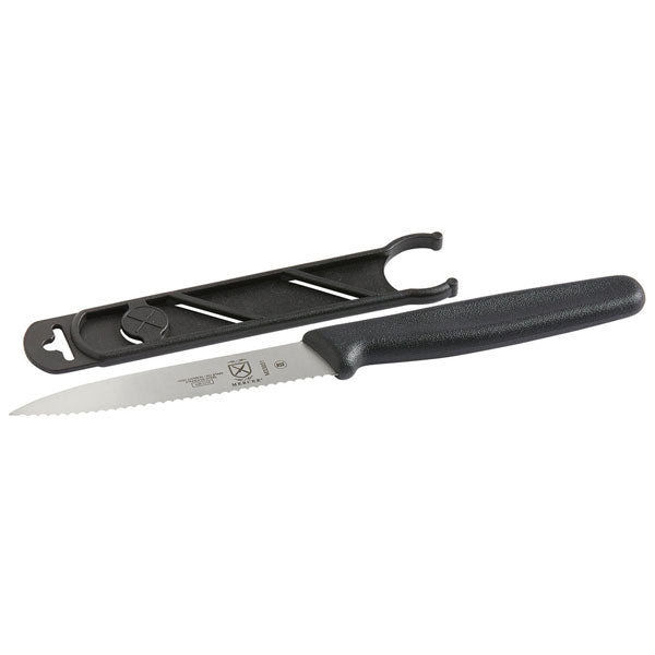 Designed to effortlessly cut fruits, herbs, and vegetables for garnishing puposes, or to make your signature drink, this 4″ Serrated Pointed Tip Paring / Bar Knife with Guard is sure to become a favorite in your commercial kitchen or bar. Its pointed tip lets you pierce through thick crusts or skins with ease and the serrated side is excellent for cutting through tough skins.