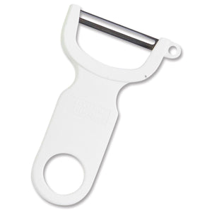 Peeling is a frequent cooking task – and one that’s particularly easy with the right kitchen gadget. Quickly and efficiently peel fruits and vegetables with this 4″ White “Y” Vegetable Peeler with Straight High Carbon Stainless Steel Blade. This “Y” peeler offers an amazingly useful addition to both your back and front of house operation like quickly peel potatoes, carrots, and cucumbers in time for dinner service, or use to create strips of citrus peels to finish off your hand-crafted cocktail with a smart touch.