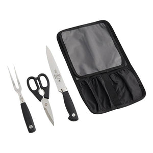 This 4-piece carving set makes a versatile and valuable addition to any establishment that is dedicated to carving meats. It has a high performance, soft material that offers a safe and comfortable non-slip grip for all-day use and will not break down when exposed to kitchen oils and can withstand extreme hot and cold temperatures. The blades are made from high carbon German steel.