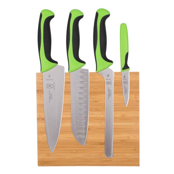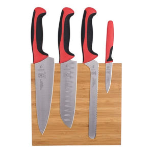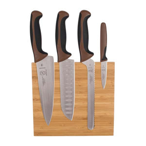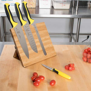 This 5-Piece Bamboo Magnetic Board and Handle Knife Set are ideal for use in any foodservice business, providing versatility, ease of use, and mobility, no matter where you are preparing your signature recipes. This set includes 4 different knives and an acacia bamboo board, giving you everything you need to quickly organize cutlery in the kitchen or for display cooking purposes.