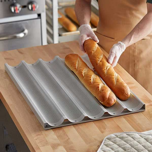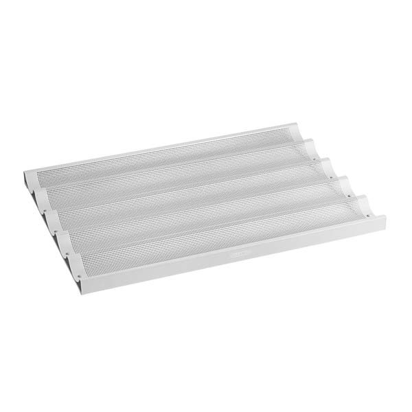 Provide customers with fresh-made baguettes with this 5 Slot Aluminum Baguette Pan from Winco. The perforated design encourages better airflow around the bread while it bakes to get a crispier crust. The open ends of the pan allow for well rounded, brown ends on the heels of your bread, making it a must-have for baking the perfect baguette. The non-stick coating on this pan is safe to use in your commercial environment, and it also helps guarantee the bread won’t stick so your presentation remains impeccable.