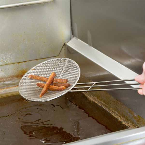 Carefully and effectively remove items from stockpots, steamers, and fryers with this 6-1/2″ Long Tin Plated Fine Mesh Skimmer. This skimmer highlights a strong wire mesh bowl and long, Tin Plated, one-piece handle. Use it to exclude particles from your fryer, as well as lost french fries, chicken fingers, mozzarella sticks, and corn nuggets. Use it when cooking donuts, poached eggs, and dumplings. With this skimmer, your options are endless.