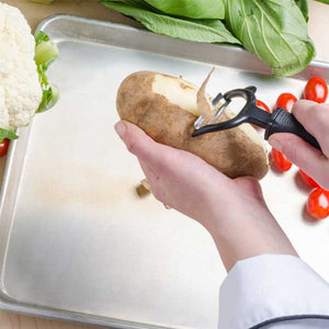 This 6-1/2″ Straight Edge Y Peeler is an indispensable addition to both your back- and front-of-house operations. Use it to securely julienne vegetables or citrus fruits to make special ingredients for recipes, toppings, garnishes, or citrus zest strips for pastries or cocktails. The peeler’s Y-shaped design enables you to peel in a simple top-to-bottom direction while offering a wider handle over straight-shaped peelers for a better hold.