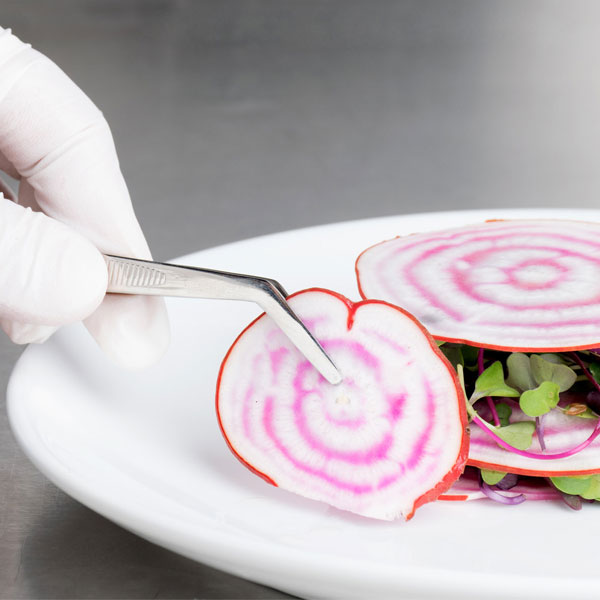 These 6 1/8″ Curved Precision / Plating Tongs are used for decorating pastries and main courses without cutting or breaking your smallest or most delicate ingredients. They’re ideal for precise plating applications, so you can add detail to any dish at your hotel, event, bakery, or upscale restaurant.