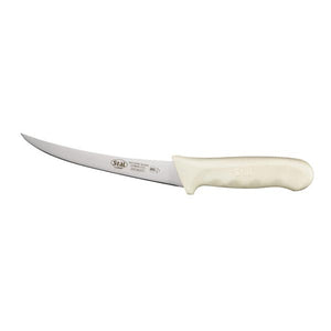 Giving incredibly lean, properly portioned cuts of fish and poultry, this boning knife is a staple for any restaurant, butcher shop, or grocery store. Excellent for fast-paced, high-volume settings, the edge of this NSF-listed knife is easy to maintain and sharpen while its curved, stiff design follows the natural curve of the meat for precision control. With its white polypropylene handle, this boning knife provides a balanced and comfortable grip.