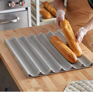 Provide customers with fresh-made baguettes with this 6 Long Slot Aluminum Baguette Pan from Winco. The perforated design encourages better airflow around the bread while it bakes to get a crispier crust. The open ends of the pan allow for well rounded, brown ends on the heels of your bread, making it a must-have for baking the perfect baguette. The non-stick coating on this pan is safe to use in your commercial environment, and it also helps guarantee the bread won’t stick so your presentation remains impeccable.