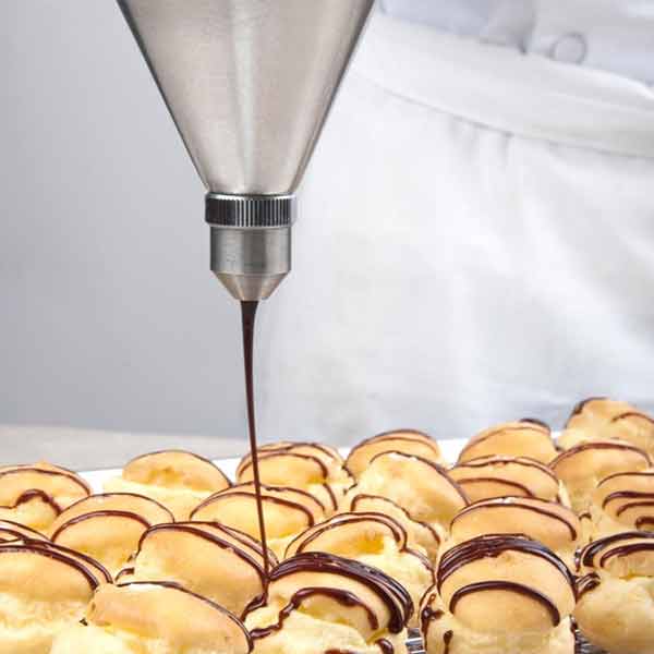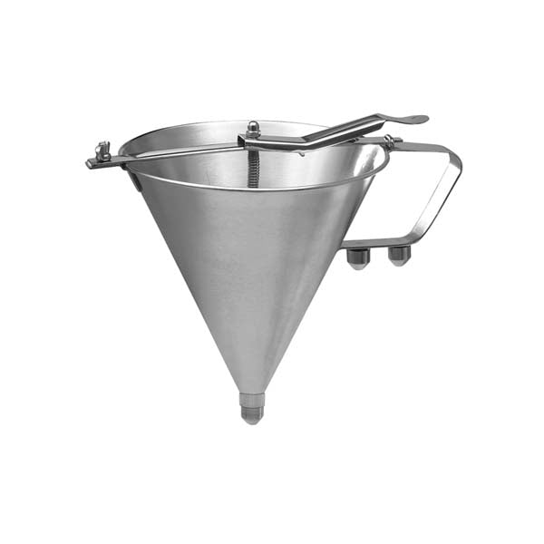 Made of stainless steel for strength and easy cleaning, this dispenser funnel has a simple operation that can be used with one hand, with its spring valve design. Whether you’re coating a flaky pastry with a fine raspberry drizzle or carefully portioning out cupcake batter, this dispenser funnel is an excellent tool to have in your kitchen. This confectionery funnel includes 3 nozzles with 4mm, 5mm, and 6mm diameters and features a spring valve feature for great balance and precise control with single-handed operation.