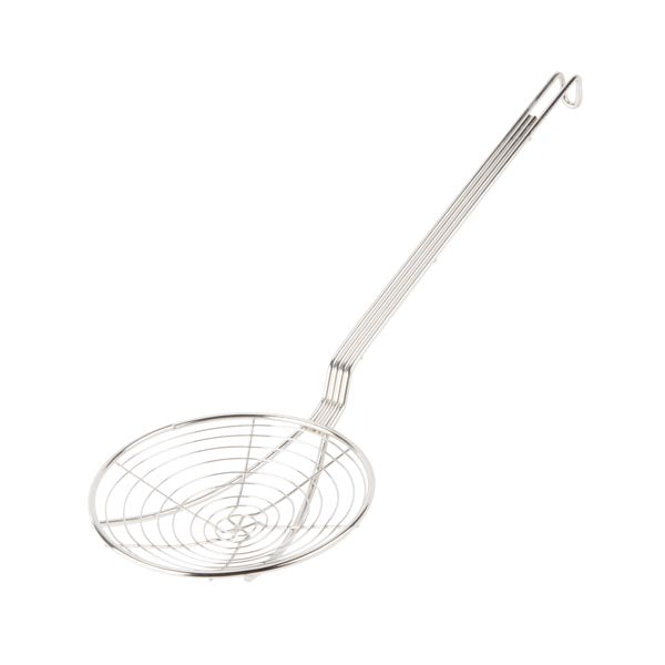 Carefully and effectively remove items from stockpots, steamers, and fryers with this 7″ Diameter Round x 19-1/4″ Long Nickel Plated Spiral Wire Skimmer. This skimmer highlights a strong wire mesh bowl and long, Tin Plated, one-piece handle. Use it to exclude particles from your fryer, as well as lost french fries, chicken fingers, mozzarella sticks, and corn nuggets. Use it when cooking donuts, poached eggs, and dumplings. With this skimmer, your options are endless.