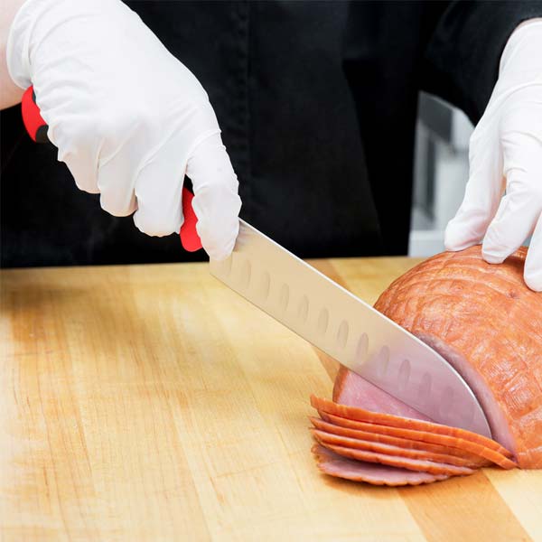 Use this 7″ Granton Edge Santoku Knife with Red Handle to slice, dice, mince, or chop anything from fruits and vegetables to meats and poultry. This makes it ideal for