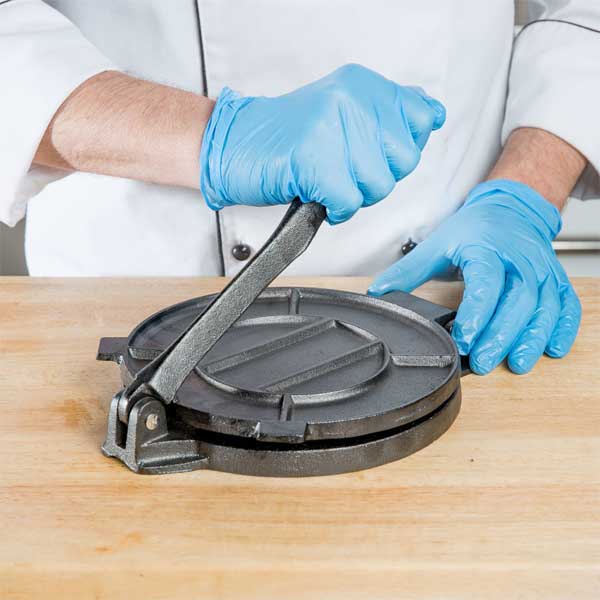 Shape authentic tortillas quickly and easily with this 8″ cast iron tortilla press. This strong tortilla press makes it easy to flatten and form tortillas for your signature dishes. Whether corn- or flour-based, your tortilla dough balls will flatten in an instant with this tortilla press. Also, since it’s made of cast iron, this tortilla press can be seasoned for a non-stick surface, ensuring easy removal for faster production.