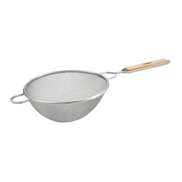 Take on your largest straining tasks and ensure that your finished sauces and gravies have a smooth texture with this 8″10 1/2 Stainless Steel Medium Double Mesh Strainer from Winco. This round strainer is excellent for making soup stocks and straining a variety of clumpy ingredients so you can serve your guests a complete product with the right consistency. This strainer highlights a rigid, double layer of tin mesh with reinforcing bands for heavy-duty use. The double layer of the mesh can withstand more pressure from a wooden spoon or pestle pushing solids through.