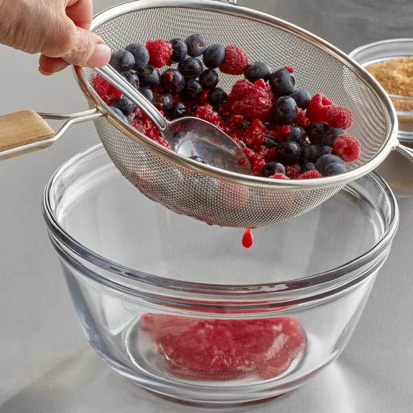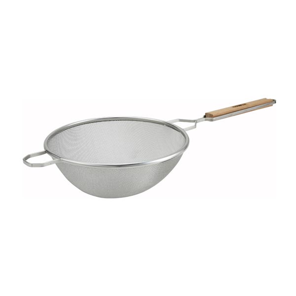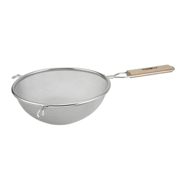 This 8″ ''10 1/2 Diameter Single Mesh Strainer is great for making stocks and straining a variety of clumpy ingredients so that you can serve your guests with a finished product with the right consistency. It can even be used for sifting flour and sugar, as well as dusting powdered sugar over cakes. This Medium Single Mesh Strainer highlights a single layer of tin mesh for excellent filtration. It also has a convenient hook so you can hang the strainer on pots and pans. Constructed of tin, it has an attractive long wooden handle to keep your hands at a safe distance from foods.