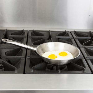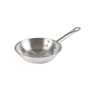Whether you’re frying, sauteing, or steaming, this 8″ fry pan will support you get the job done. Created with shallow, curved sides, this pan helps easy stirring while its 18/8 stainless steel construction distributes heat evenly across the surface. Exceptionally durable and safe to use, this NSF certified fry pan will last heavy-duty use while its riveted handle guarantees ease of handling.