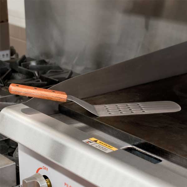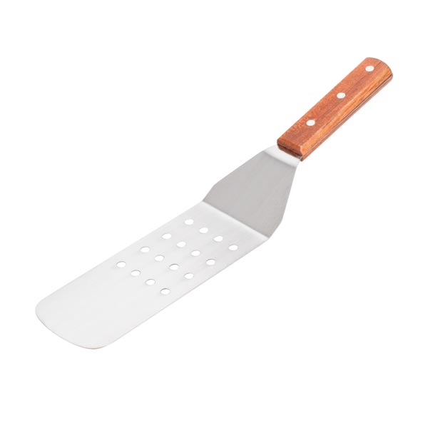 Excellent for flipping pancakes, burgers, or panini, the 9 1/2″ Blade Perforated Flexible Turner with Wood Handle from Winco is a must-have in any kitchen. Highlighting a thin, flat stainless steel blade, this spatula quickly glides under delicate foods and is strong enough to endure high-volume cooking on a grill or griddle. For added comfort, this turner is made with a wooden handle, for a convenient grip while keeping your hands safely away from the heat.