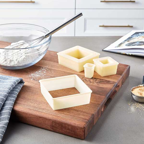‘- This 9 Pc. Square Plain Nylon Cutter Set has Beveled Cutting Edge For More Excellent Precision – One Piece Seamless Pattern For Superior Sanitation – Rounded Top Edge Provides