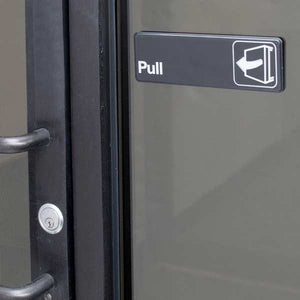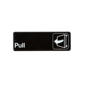 Assure that your customers and employees know which way to open your doors with this 9″ x 3″ pull sign from Tablecraft. Made of durable plastic, this sleek sign has great color contrast. The white-on-black lettering enables your customers to see and read this sign from across a room. For those who may have difficulty in reading, a symbol is posted to the side.